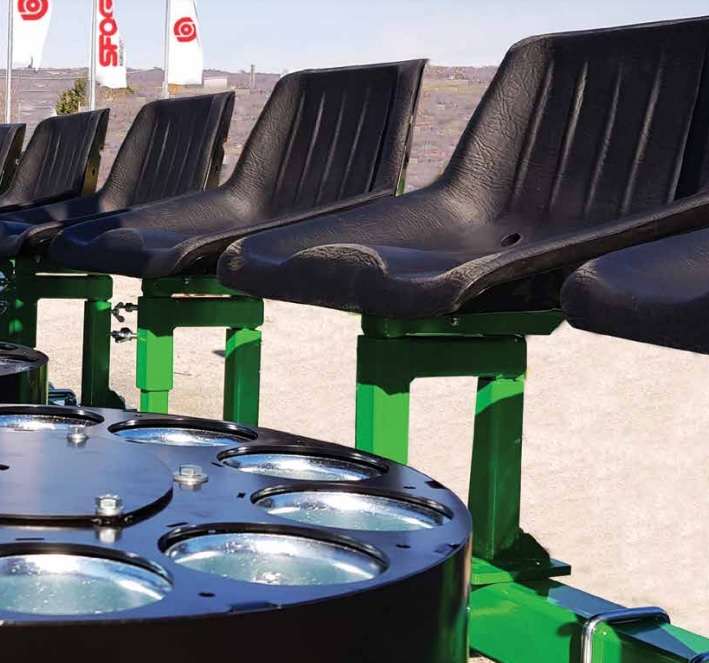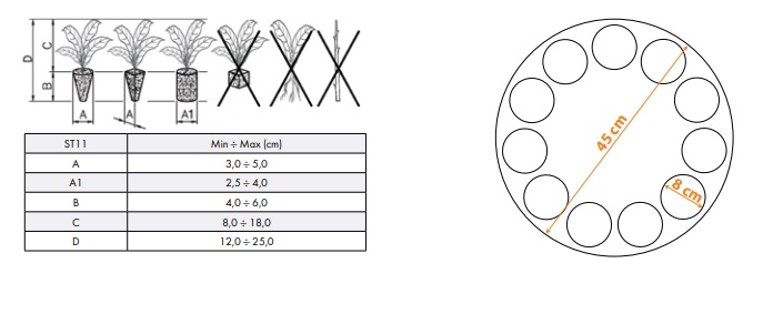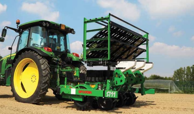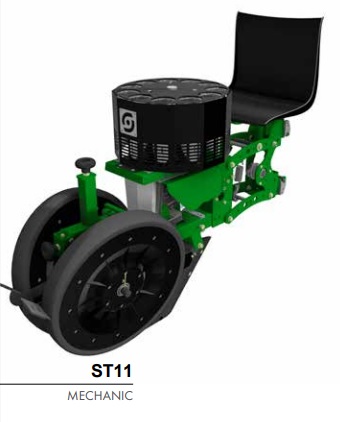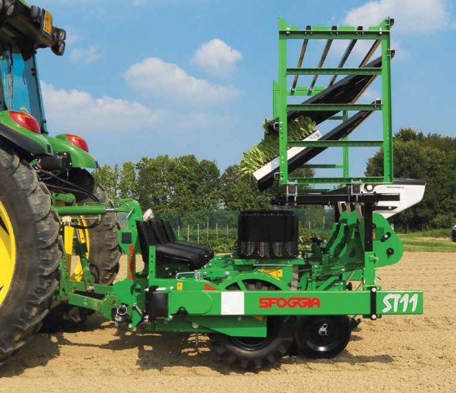 A SFOGGIA ST11 félautomata palántázógép keskeny, minimum 45 cm-es sorközi ültetésre készült. Szaggatott mozgású forgódobos adagoló és Guillotine rendszer a nagyobb sebességű és egyenesebb palánta esés érdekében.