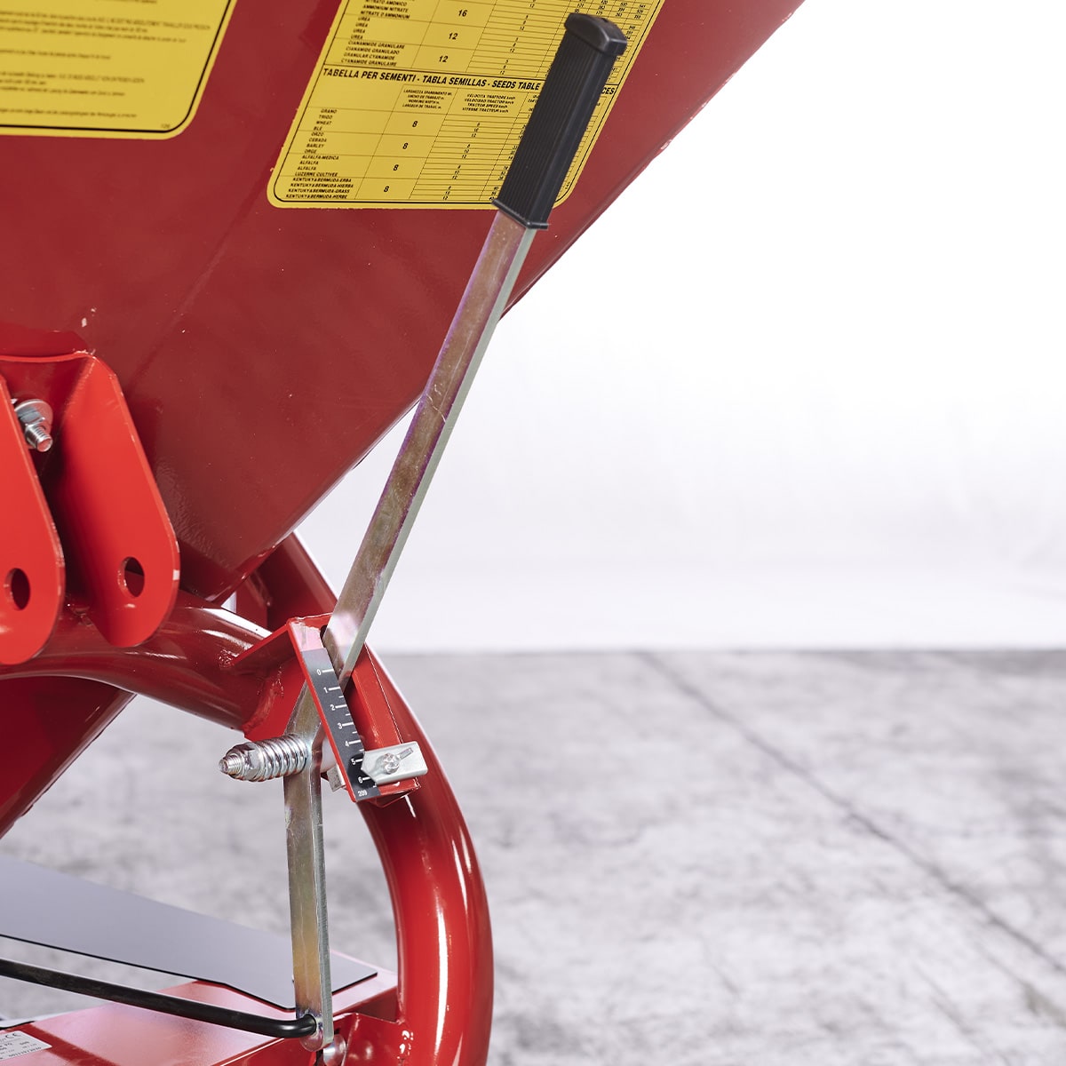 Galvanizált acél kúp alakú garat, 4 vagy 6 uszonyos speciális bevonatú röpítőtárcsával felszerelve, granulátum- vagy kristályszemcsés műtrágya szórására.