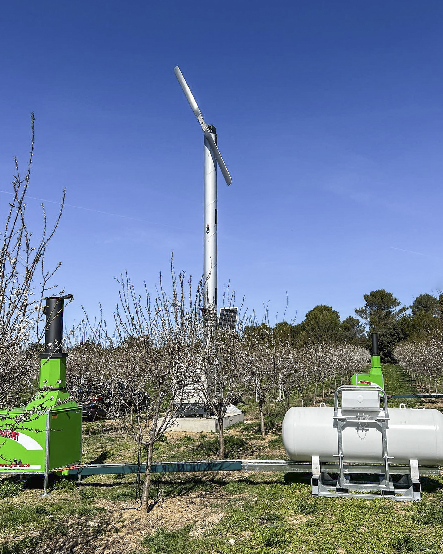 Az AgroFrost Frostguard egy telepített gép, saját tengelye körül forogva képes 1 hektár terület fagyvédelmének ellátására. Működtetése az elhelyezésén túl nem igényel felügyelmet. Auto-Start rendszerének köszönhetően a megadott hőmérséklet elérésekor automatikusan elindul-leáll.